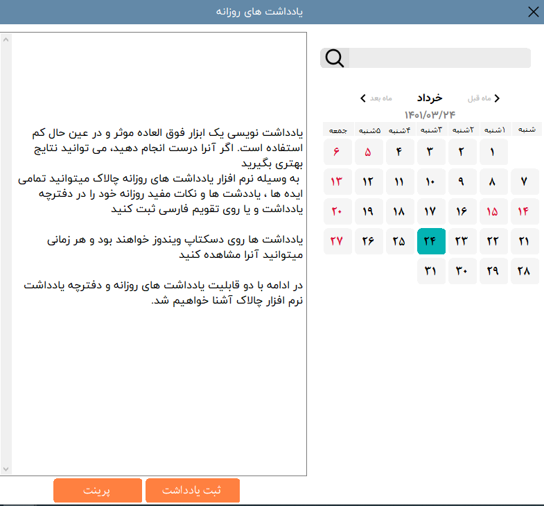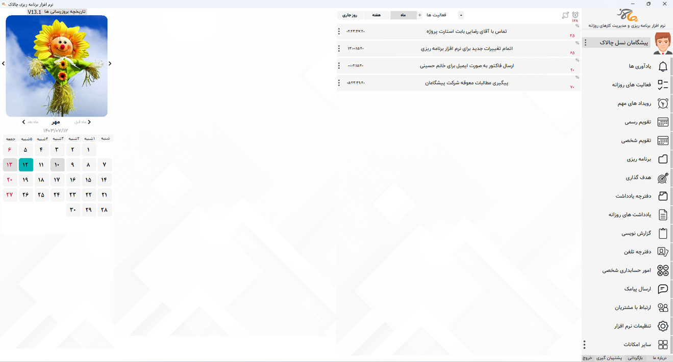 یکی از ویژگی های مهم برای کاربران ایرانی، وجود یک برنامه یادآور فارسی ویندوز است. چنین نرم افزاری نه تنها از زبان فارسی پشتیبانی می کند بلکه تقویم شمسی نیز دارد. به همین دلیل می توانید مناسبت ها، تاریخ های کاری، یا حتی رویدادهای شخصی مثل تولدها را دقیق تر مدیریت کنید. نرم افزارهایی مانند چالاک آپ در این زمینه انتخابی مناسب هستند که تجربه ای ساده و کاربردی ارائه می دهند.